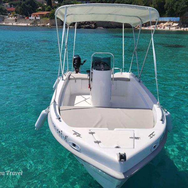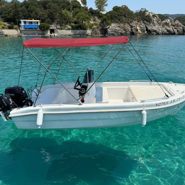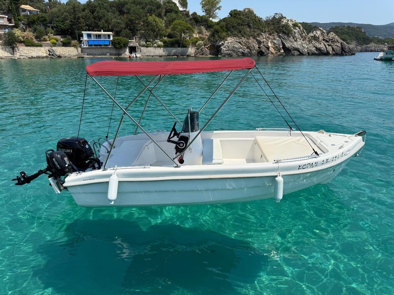 30hp, no license needed, electric starter, electric power trim, cushions, cool box,sun canopy,up to 4 people or 5 with a young child, 4-stroke engine, low fuel consumption, steering wheel.